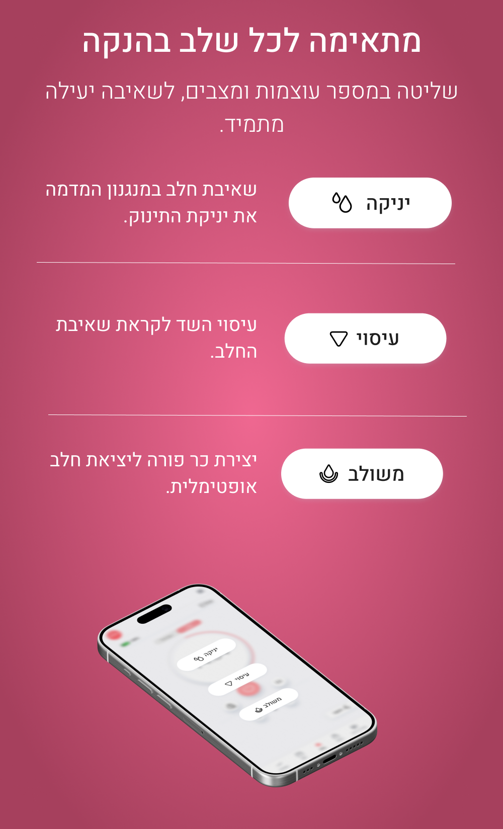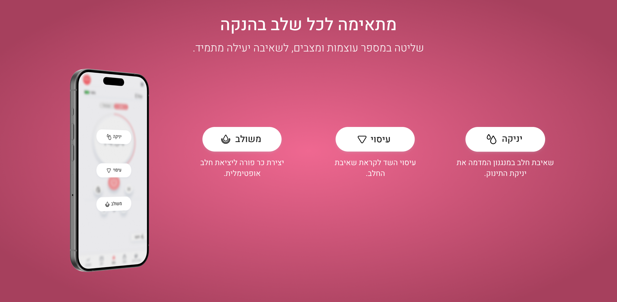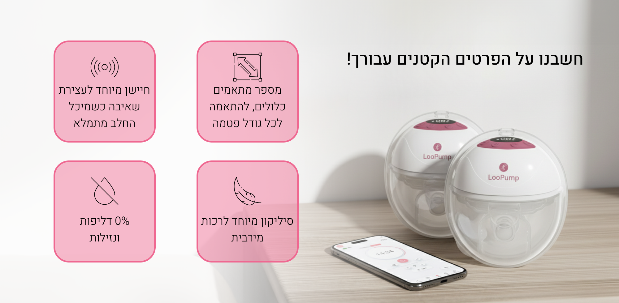שימי לב! המשאבה מתאימה לכל גדלי הפטמות. אין צורך למדוד לפני הרכישה, ולצורך הזה בדיוק תקבלי במארז סרגל מדידה וחמישה גדלי פטמות שונים להתאמה במקום.